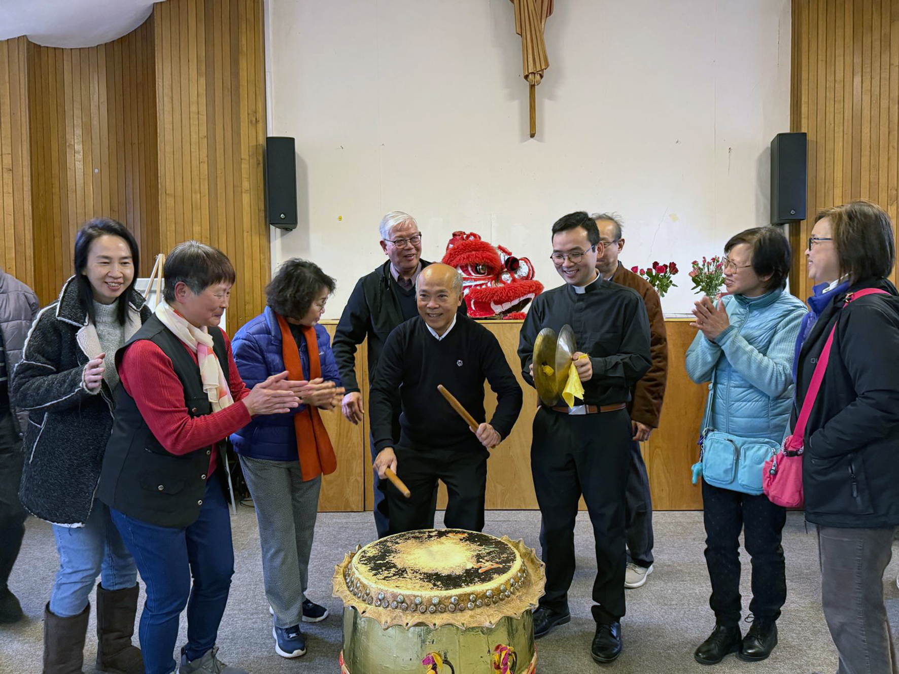 A lively traditional celebration began in the hall with a lion dance. The troupe ensured that the first act was to bow in veneration before the Crucifix on the wall.