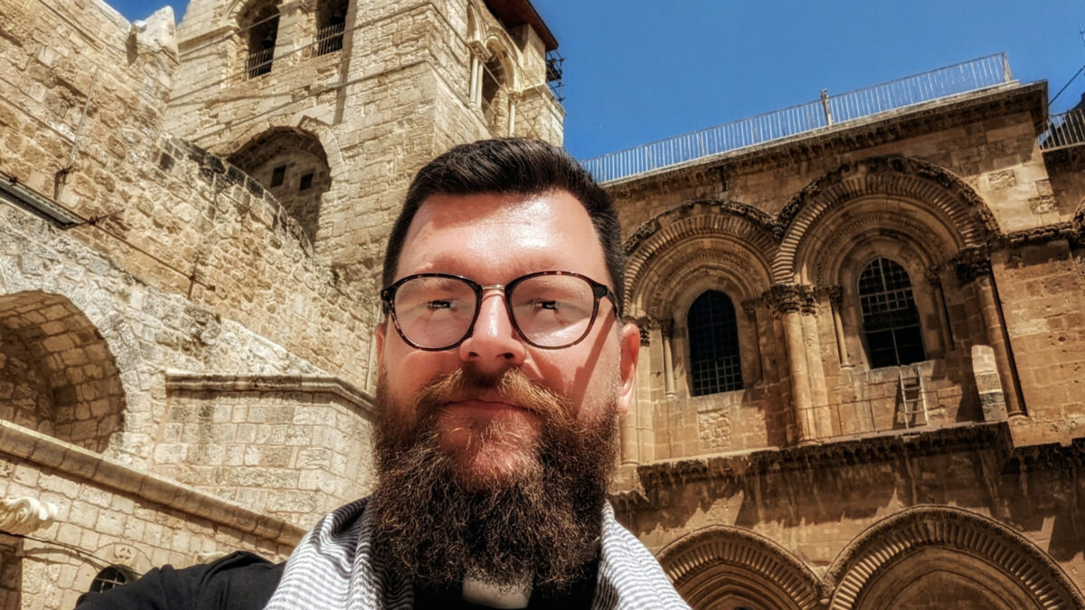Photograph: Fr Peter Wygnanski outside the Church of the Holy Sepulchre, Jerusalem.